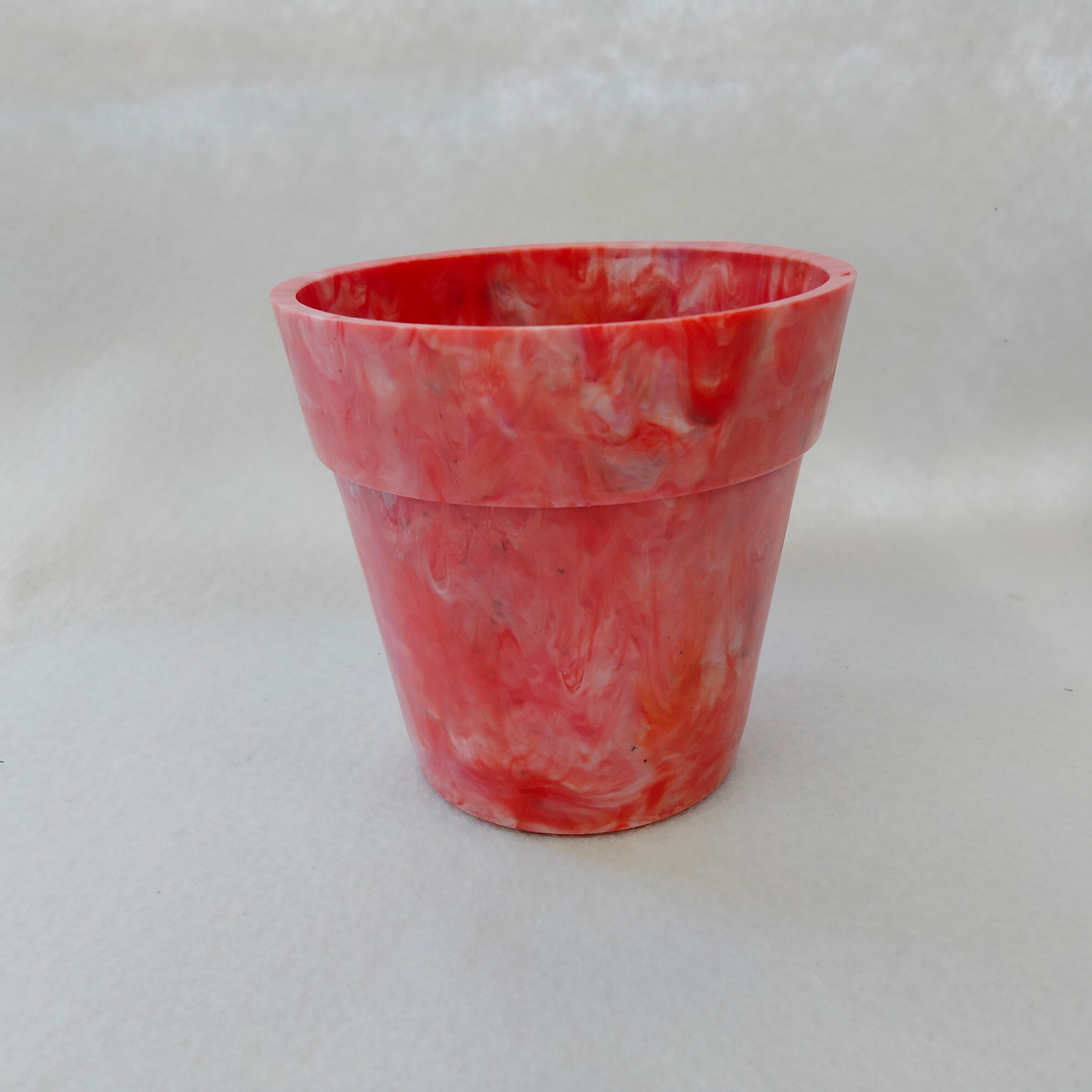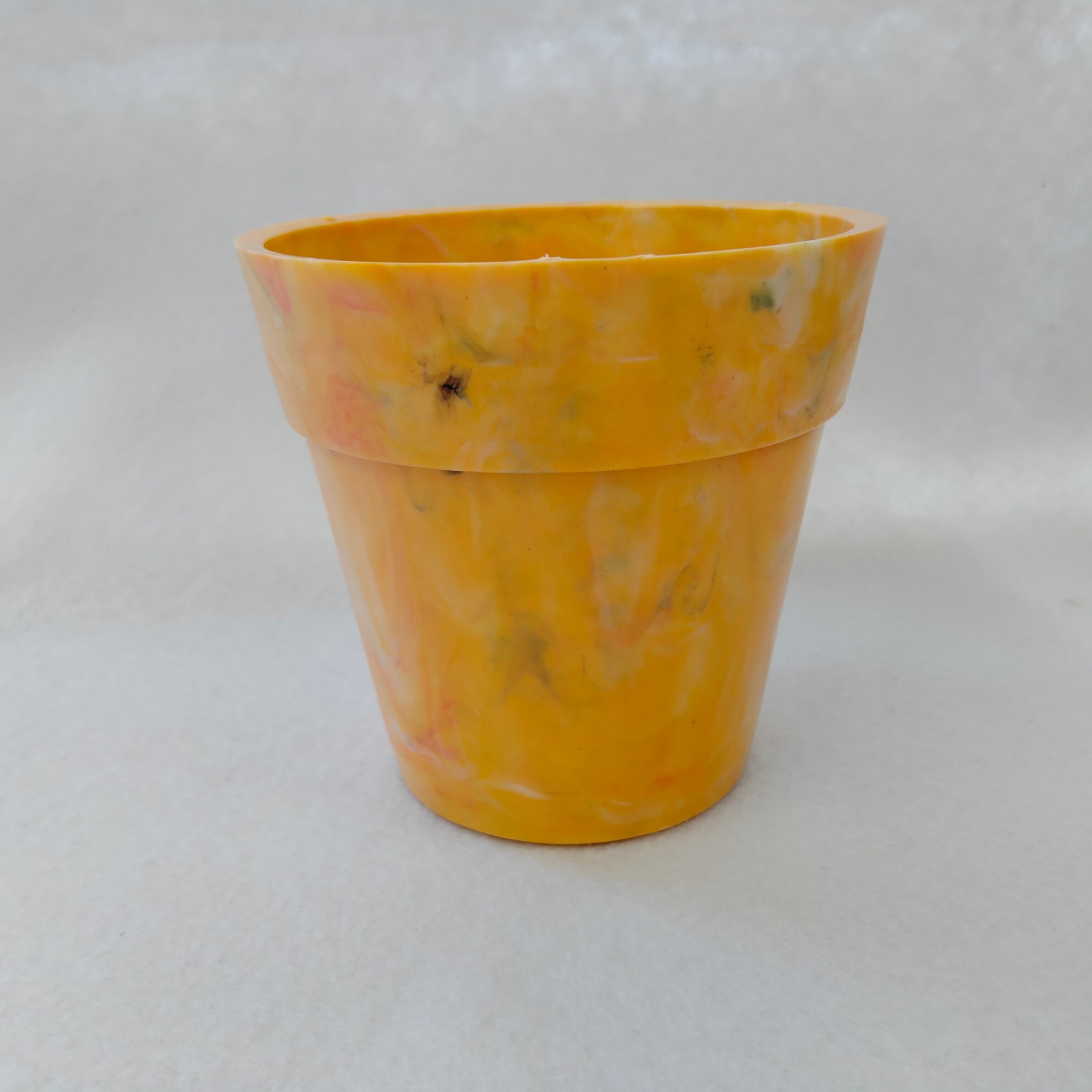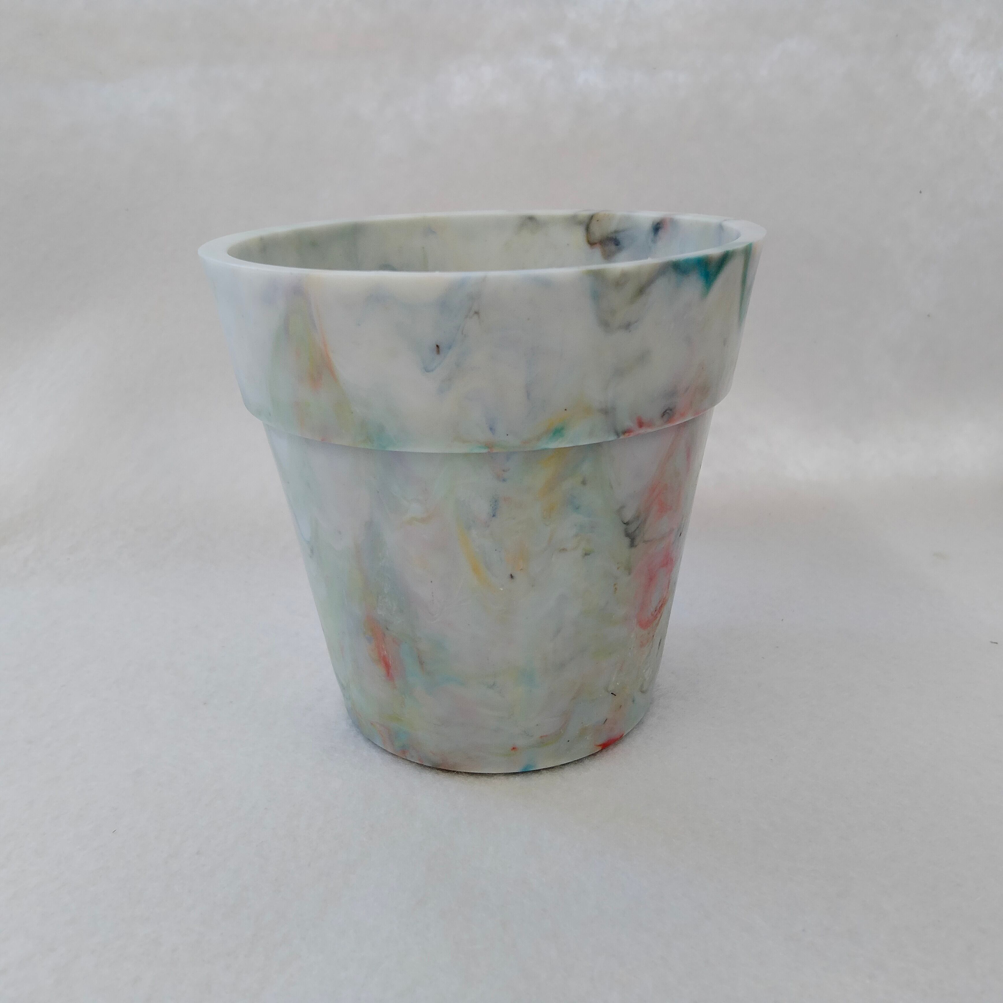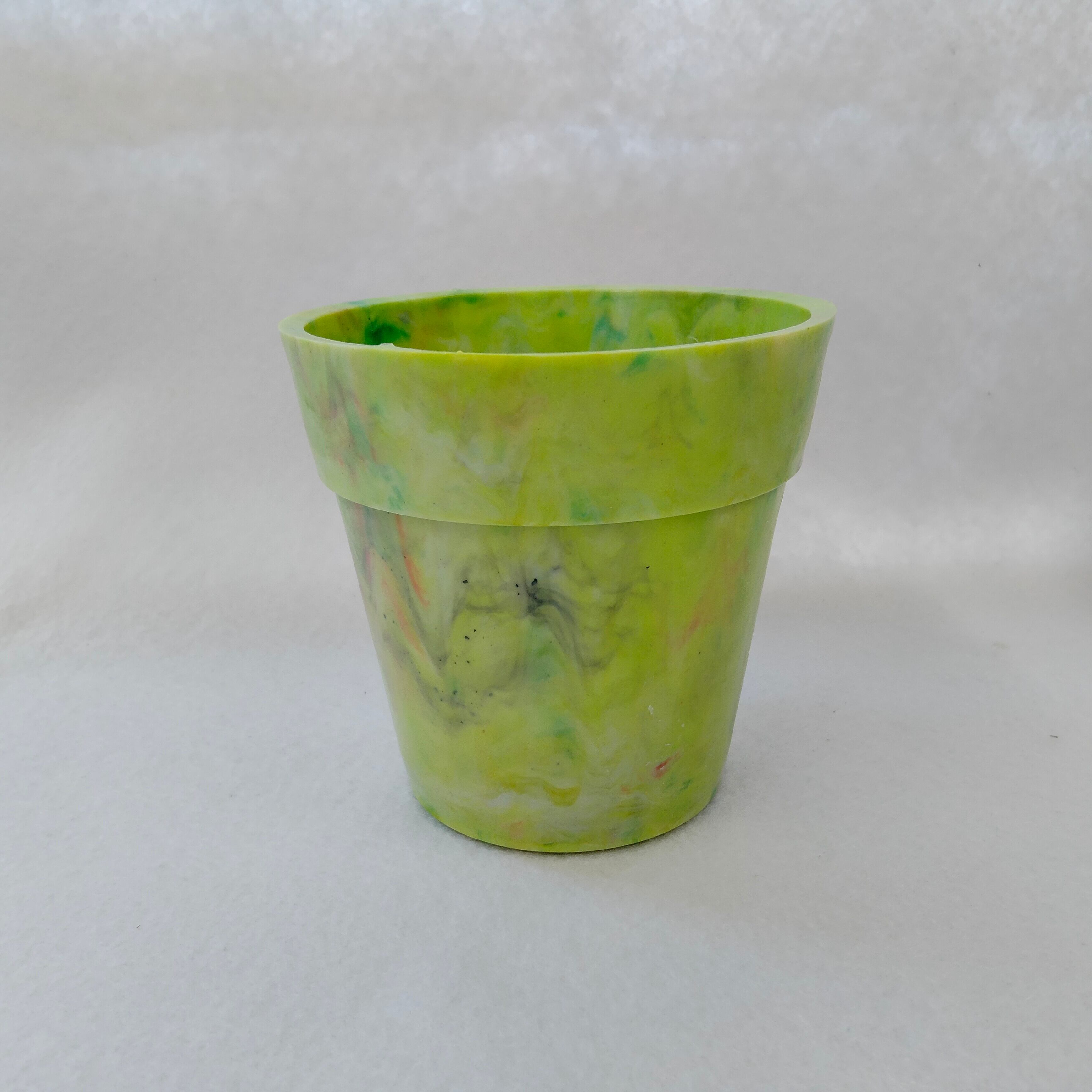 身の回りのプラスチックごみをとかして作った小ぶりな植木鉢です。