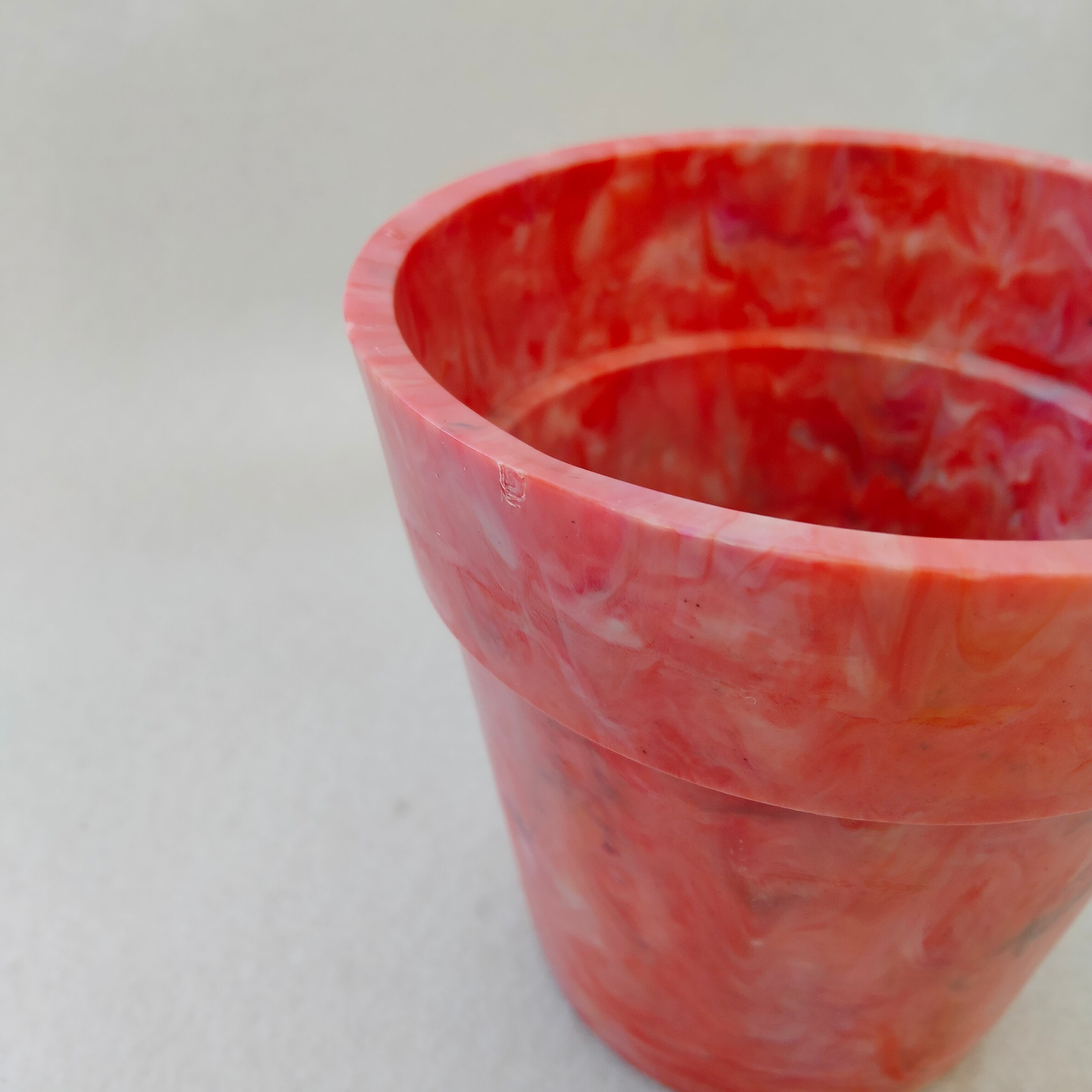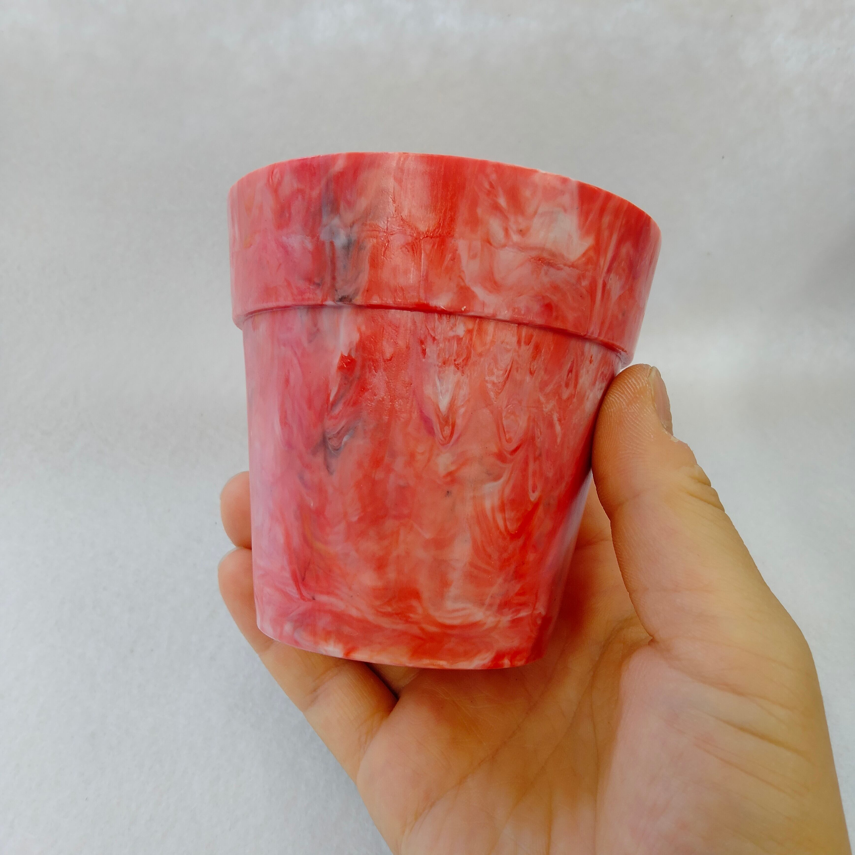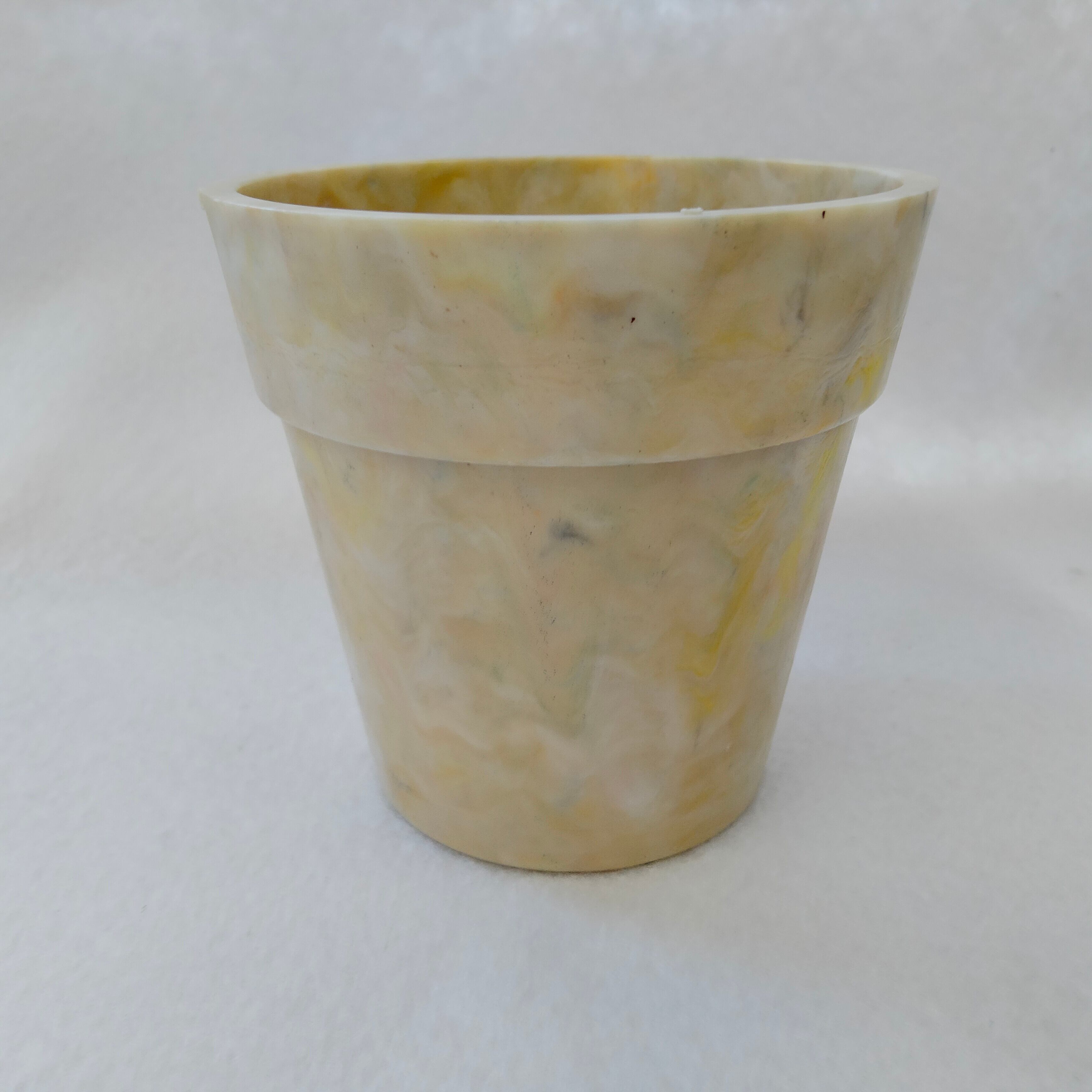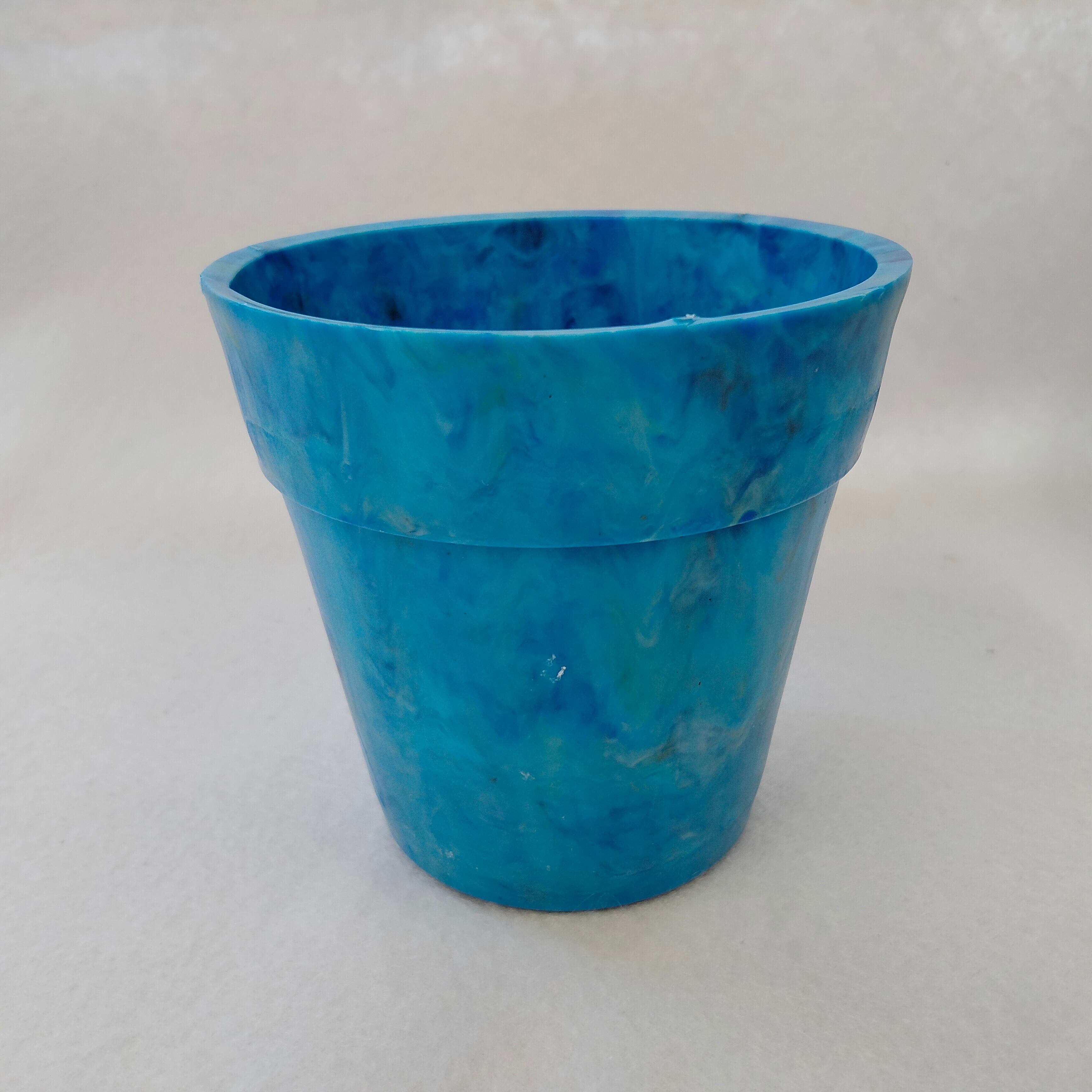身の回りのプラスチックごみをとかして作った小ぶりな植木鉢です。