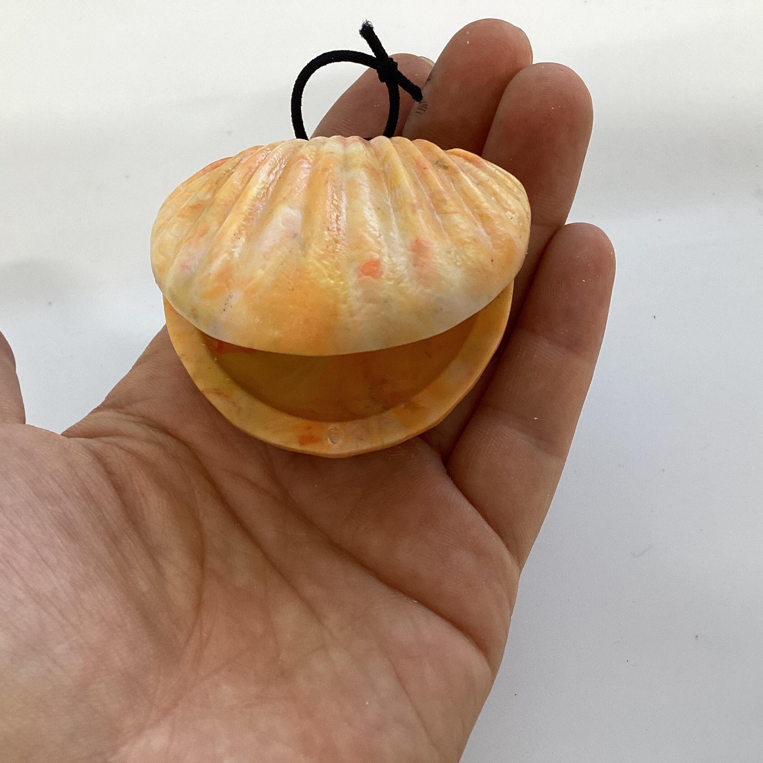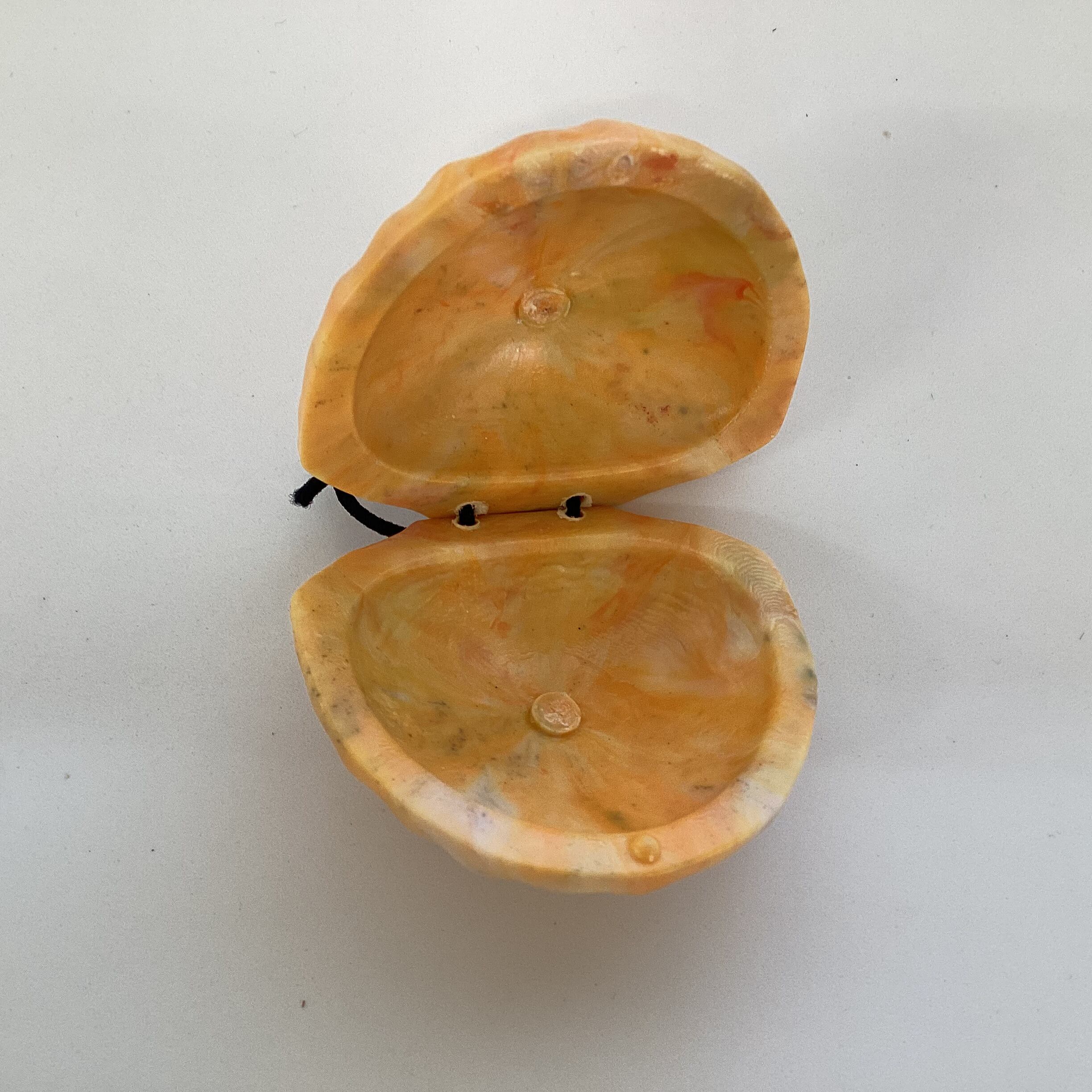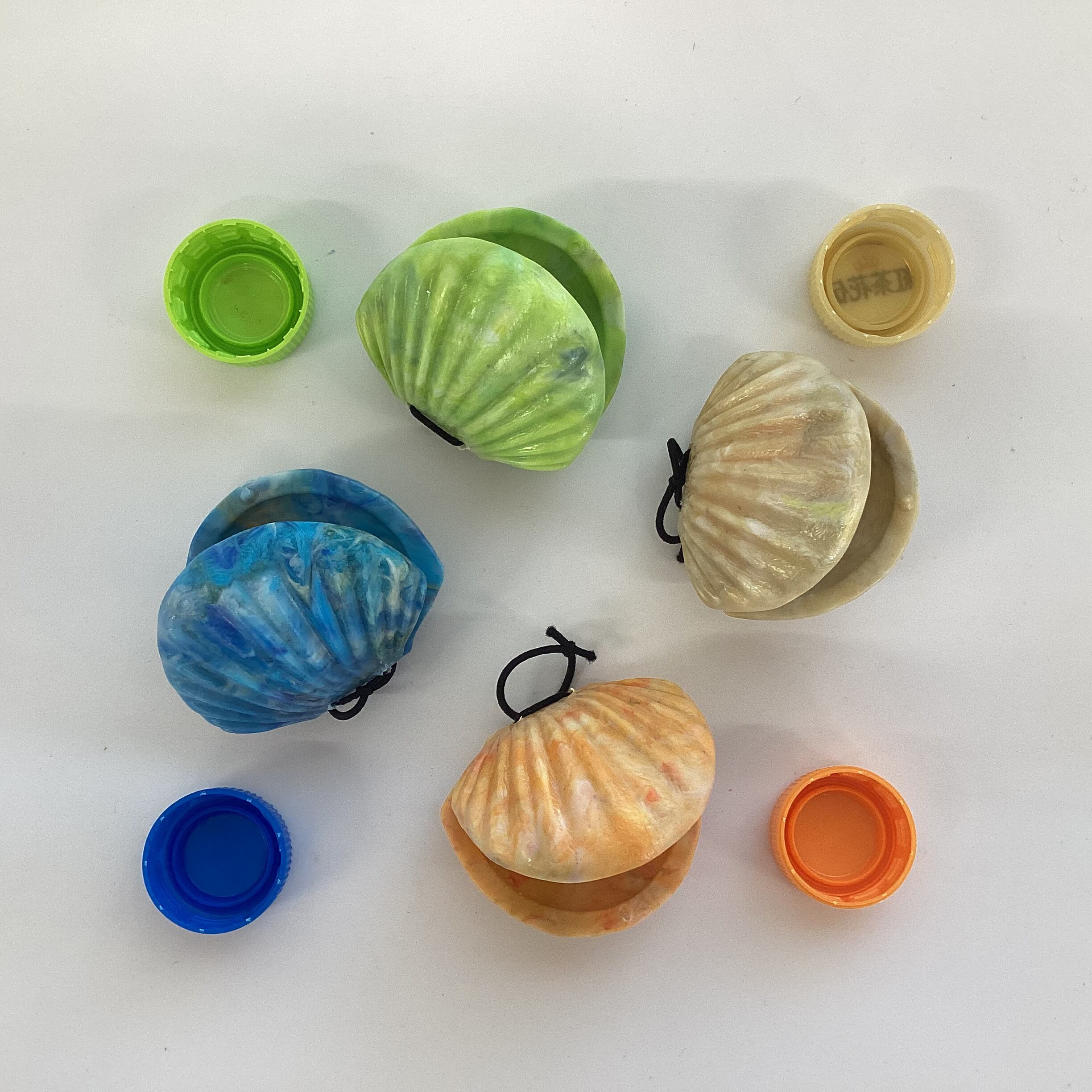 身の回りのプラスチックごみをとかして作った、貝殻の形のカスタネットです。