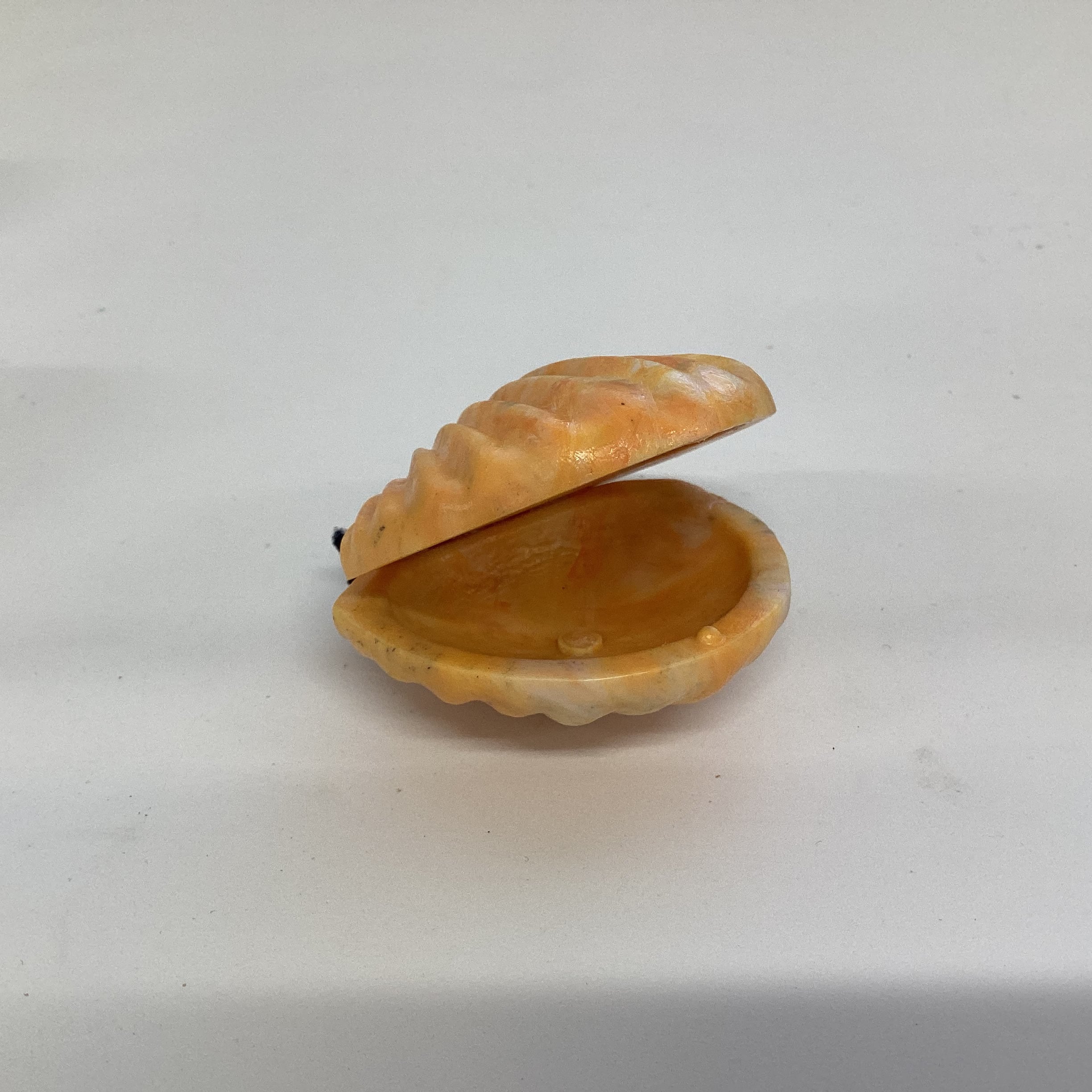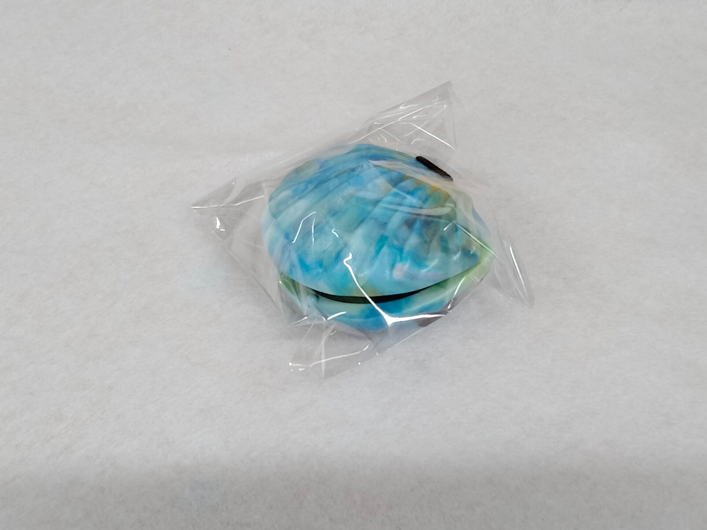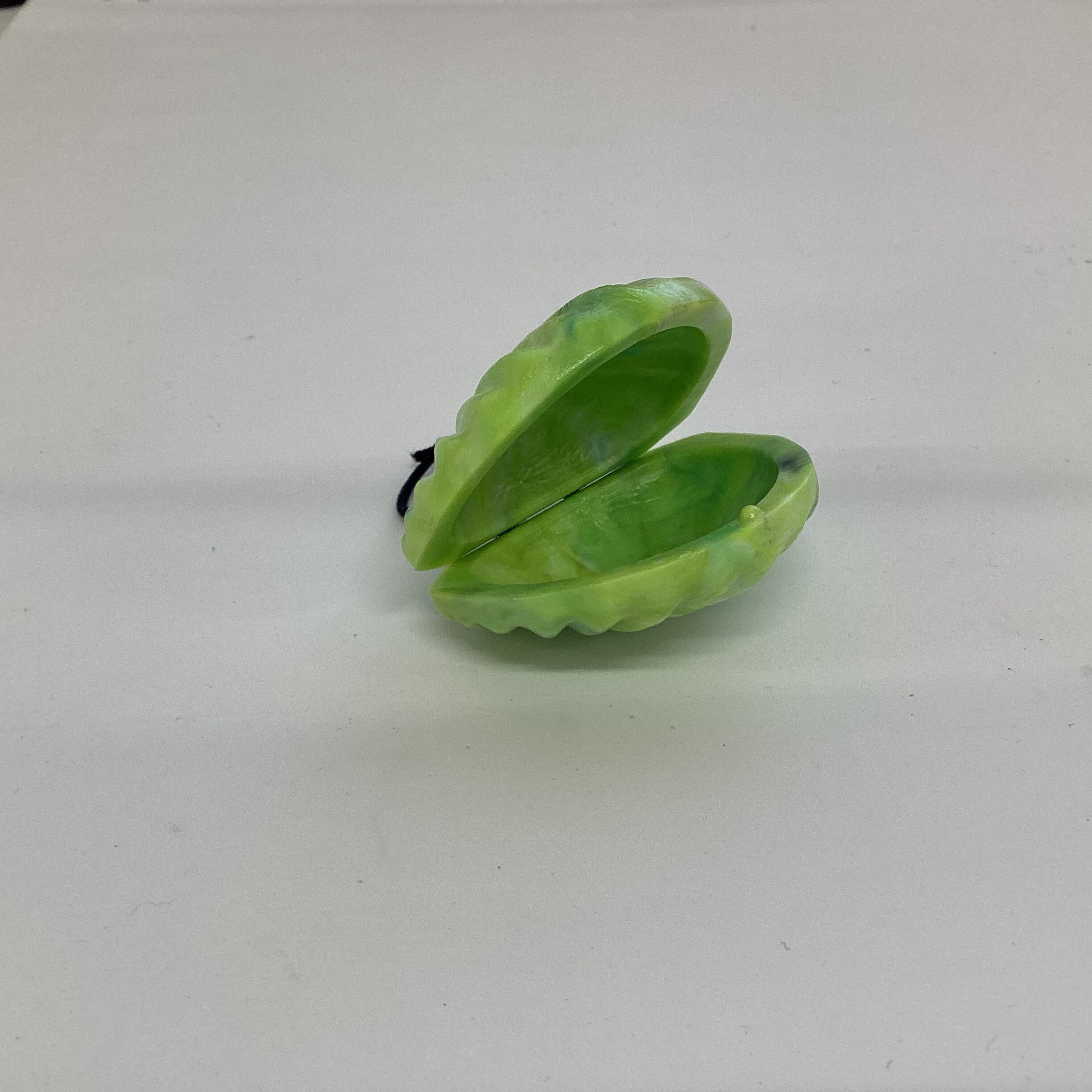 身の回りのプラスチックごみをとかして作った、貝殻の形のカスタネットです。
