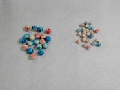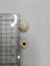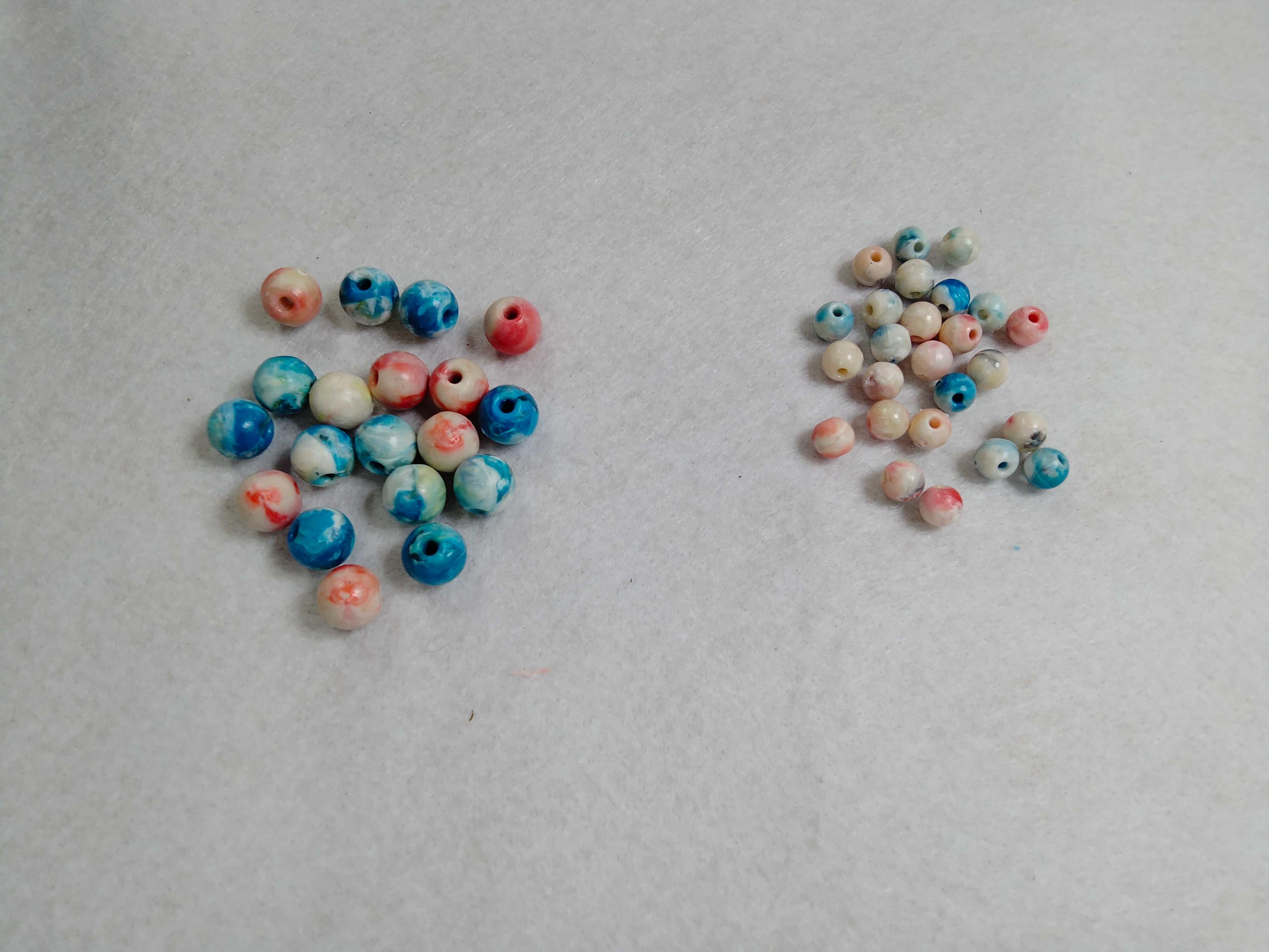 家庭などから集めたプラスチックごみをとかして作った丸いビーズ(10粒)です。